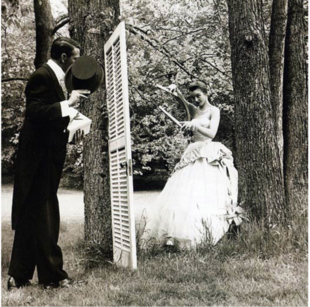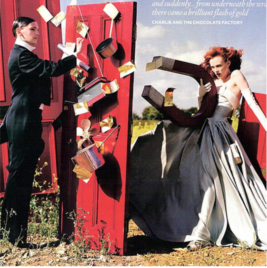 Famed window dresser for Bonwit Teller and Tiffany & Co, Gene Moore would also photograph fashions for Vogue in 1953. Moore’s 1953 photograph of a woman literally attracting a man with a magnet would be recreated by Tim Walker in 2008. Walker often restages well-known photographs, adding his signature whimsical style to the overall composition. In this version, the woman is attracting more than men with her over-sized magnet for Vogue UK‘s December 2008 issue in the editorial “Tales of the Unexpected,” which paid homage to Roald Dahl, creator of the most beloved children’s tales of the 20th century.