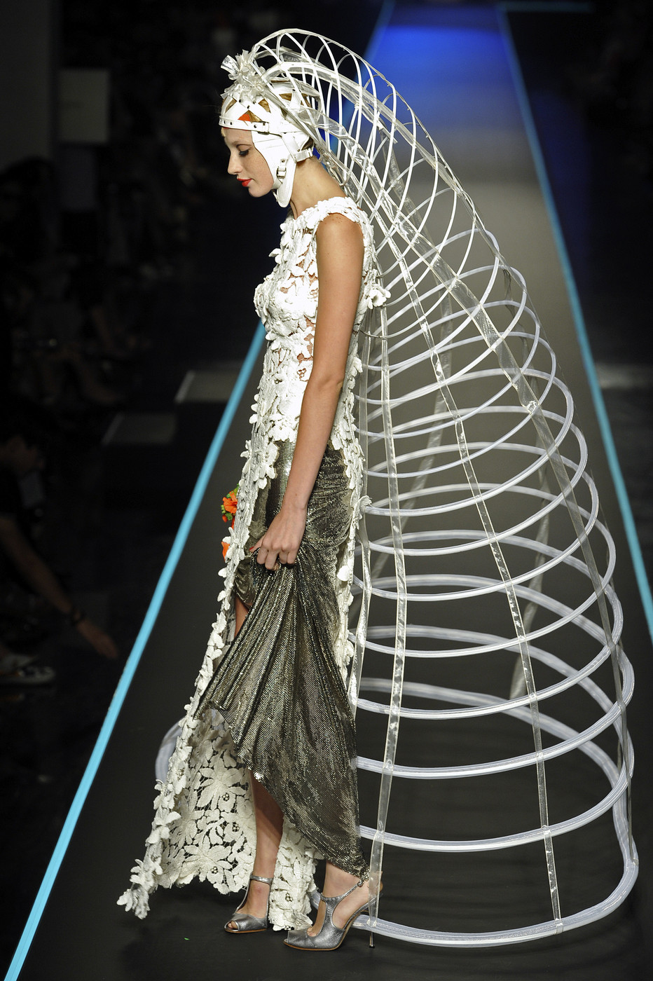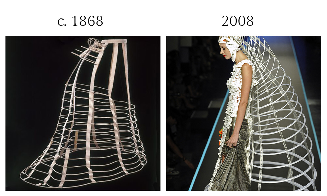 The bustle or dress improver experienced two waves of popularity in the 19th century; the first bustle period ranged from the end of the 1860s into the 1870s and the second took place ten years later in the 1880s. The steel cage of the bustle was an understructure, worn beneath the dress, to create volume and support the ruffles, bows and layers of fabric placed at the back of the fashionable 19th-century costume. Jean Paul Gaultier, who often incorporates historical elements of dress into his couture collections, created a bridal headdress resembling a bustle crinoline for his FW 2008 collection; perhaps linking the bustle phenomenon of the Victorian age with contemporary bridal culture, which also has roots in the 19th century.